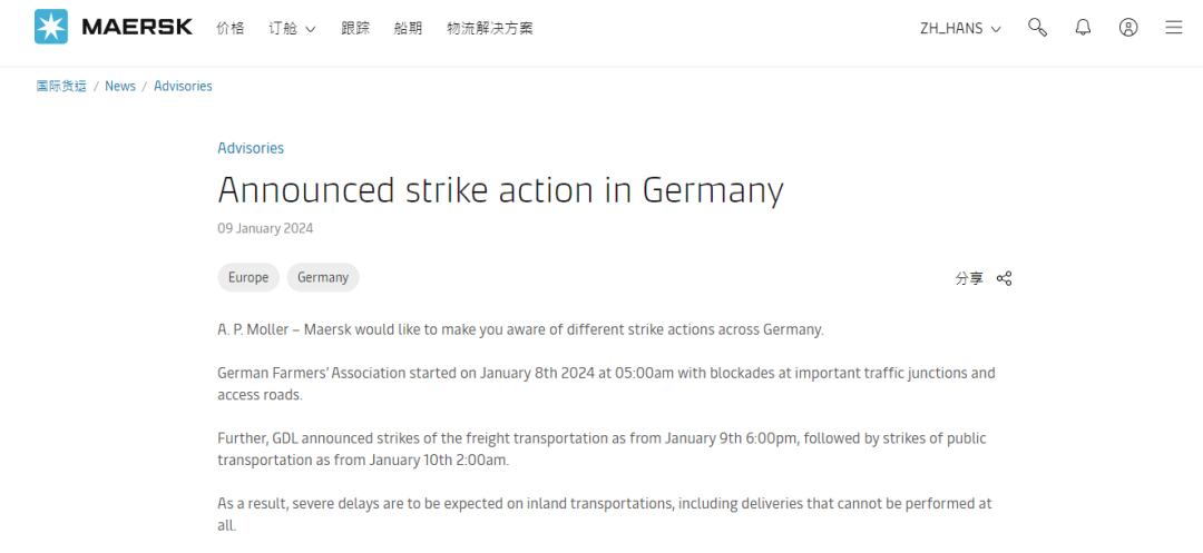 罢工发生后,航运巨头马士基也第一时间向所有客户发出紧急通知,并警告:预计内陆运输将出现严重延误,可能根本无法交付的货物。