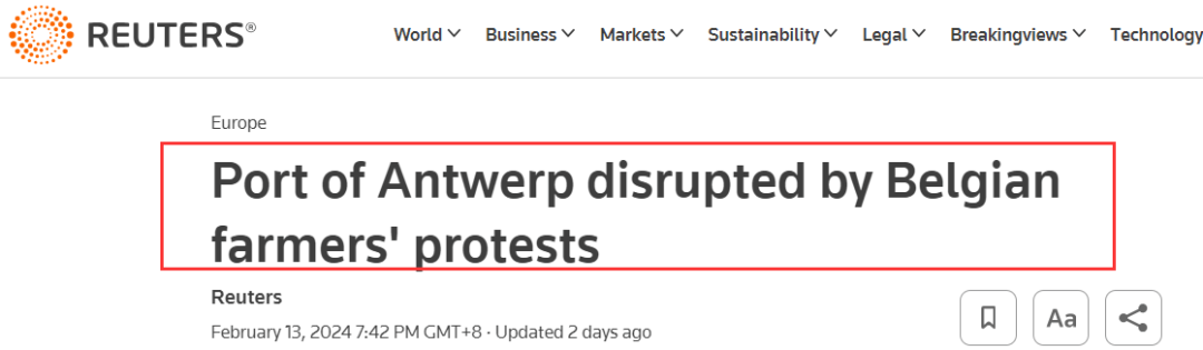 在2月初,比利时另一个港口也发生了类似的事件,据比利时通讯社(Belga)当地时间2月2日报道,由于抗议农民的封锁,约2000辆卡车被困在泽布吕赫港口地区。