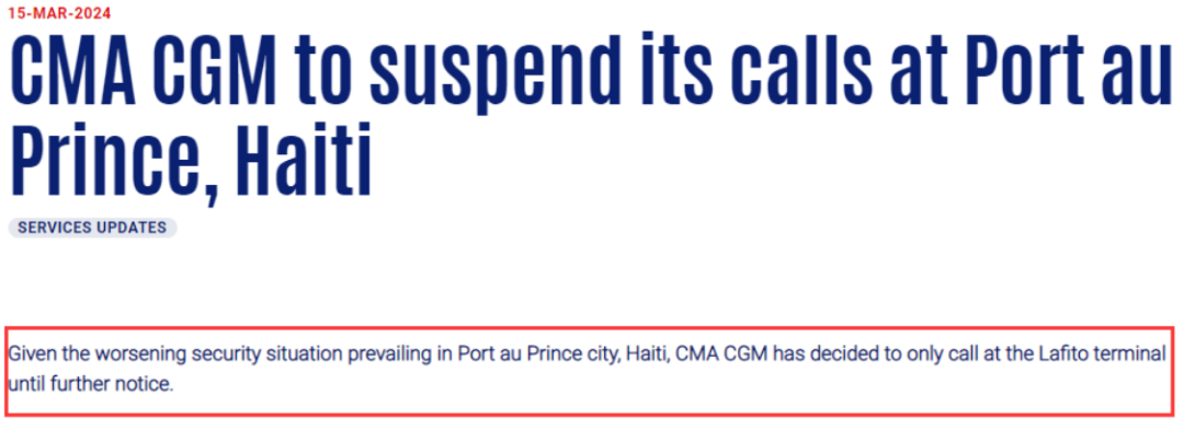 继马士基宣布暂停往返海地的订舱服务后,达飞轮船也于15日在官网发布公告,明确指出,暂停在该港的停靠服务。作为替代方案,达飞轮船将仅在距离太子港20公里的Lafito码头停靠,直至另行通知。