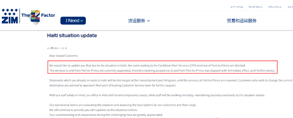 ZIM以星也发布了相关公告,停止太子港的订舱服务,并等待进一步通知。